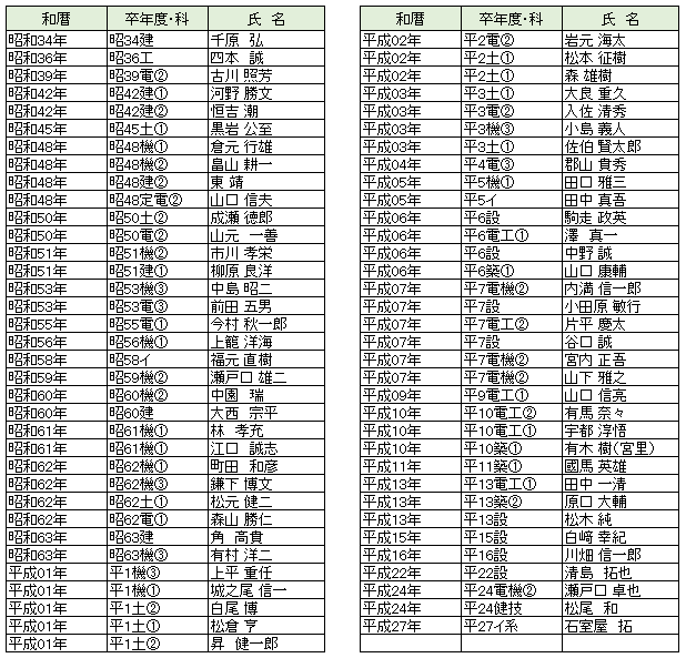OB会年会費の報告 コラム OB会の皆様、2019年度年会費のご協力ありがとうございました。今回ご協力いただいた方々の氏名を掲載いたしまので宜しくお願い致します。尚、年会費案内資料が届いておられない方で、ご協力をして頂ける方は事務局までご連絡下さい。